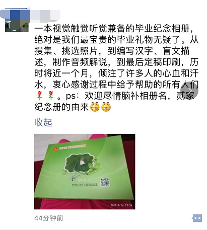 一個架子上,放著一疊厚實的精裝冊子,封面寫著“2018屆貳家紀念冊”。翻開冊子,與以往見到的一樣,紙面印著一張張燦爛而純真的笑臉和一些文字,不一樣的是,紙面上還多了一些微微凸起圓點,大約厚度1mm左右,按一種特有的規(guī)律排列,看起來晶瑩剔透,用手撫摸一下,顆粒感很真實,這就是“盲文畢業(yè)紀念冊”。